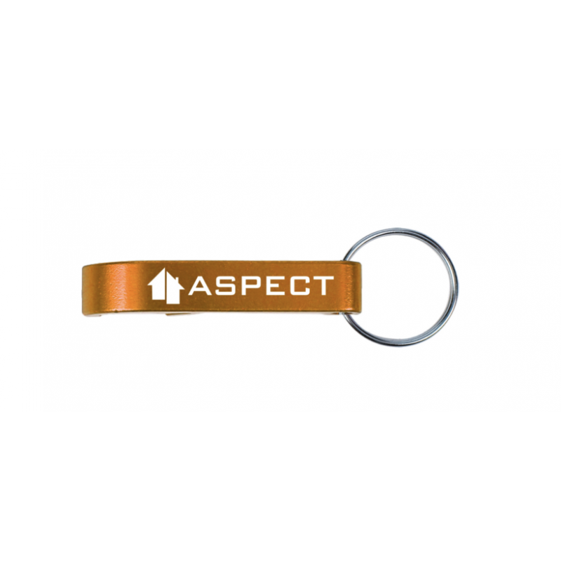 Brelok do kluczy - otwieracz do butelek, aluminiowy z grawerem Aspect, oraz kółeczkiem do zapięcia.